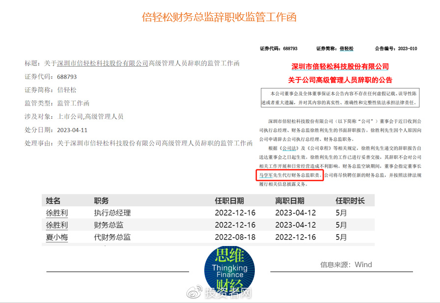 值得一提的是,就在2022年年报和2023年一季报发布前十天,倍轻松发布公告称,财务总监辞职,并迅速收到上交所的监管工作函。