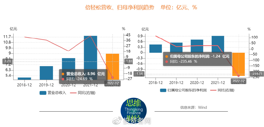 年报显示,去年一年,疫情影响下,倍轻松营收8.96亿元,同比下降24.69%,归母净利润为-1.24亿元,相较于2021年的盈利0.92亿元,同比下降高达235.46%。