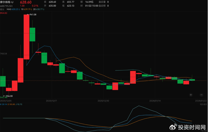 二级市场方面,截至1月22日收盘,摩尔线程股价报628.60元/股(不复权,下同),微涨0.21%,总市值为2955亿元。2026年1月以来,该公司股价涨幅为6.92%,而与去年12月上市初期941.08元/股的最高价相比,已回落33%。