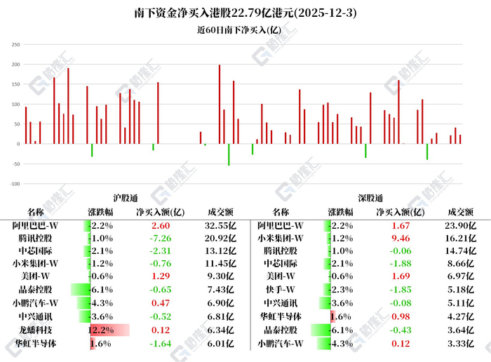 格隆汇12月3日|南下资金今日净买入港股22.79亿港元。其中:净买入小米集团-W 8.7亿、阿里巴巴-W 4.27亿、美团-W 2.97亿;净卖出腾讯控股7.32亿、中芯国际4.19亿、快手-W 1.85亿、晶泰控股1.07亿。